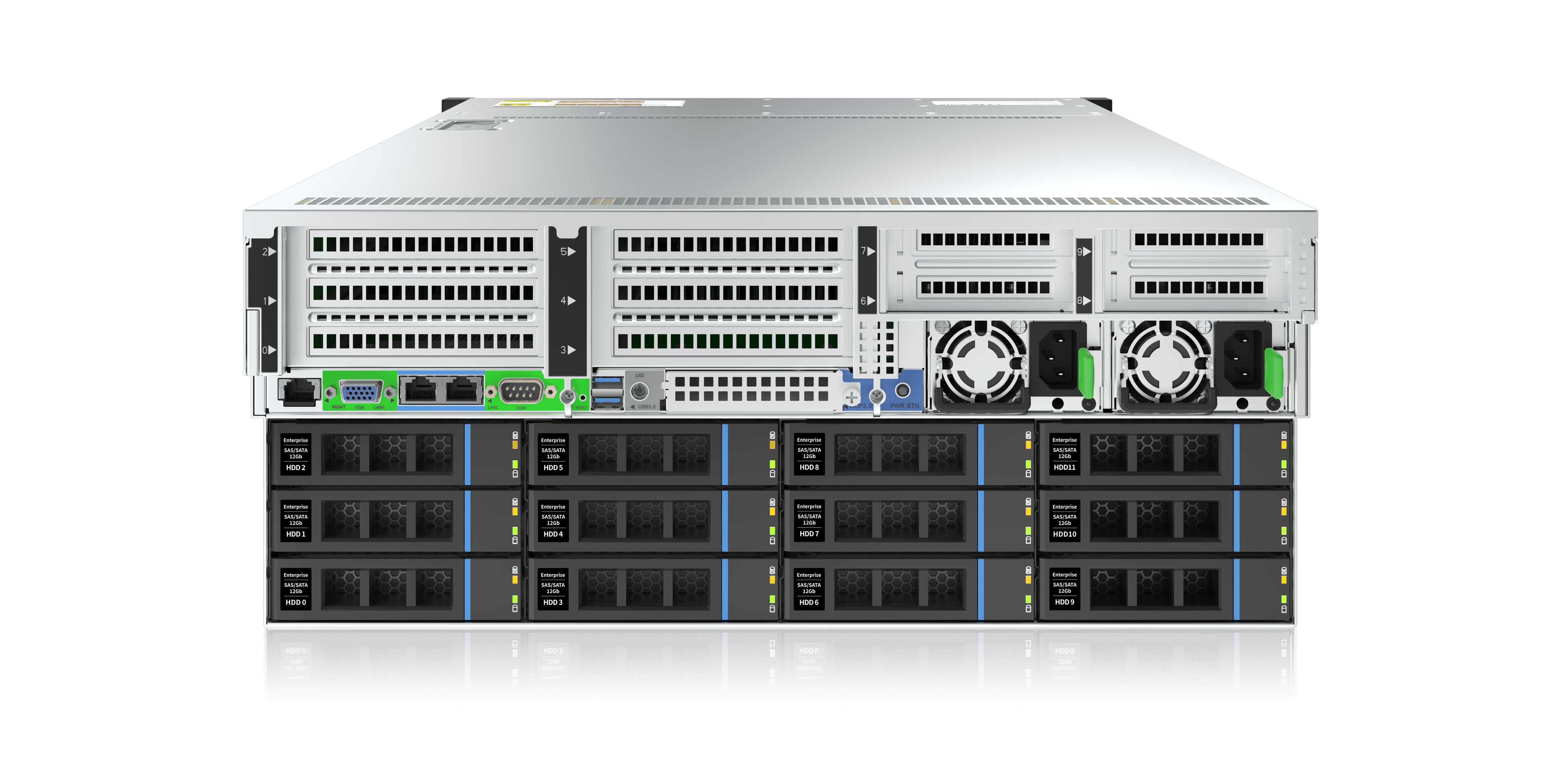 Panel frontal: 36 discos duros SAS/SATA de 3,5″/2,5″ intercambiables en caliente Panel trasero: 4 discos duros SAS/SATA de 3,5″ o 4 discos duros SAS/SATA/NVMe de 2,5″ intercambiables en caliente adicionales
